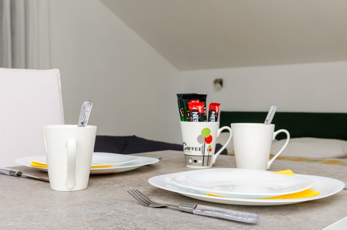 Apartment contains of double bed room with kitchen/diner/lounge area attached, with completly equipped kitchen and bathroom. Bathroom is equiped with main supplies. This apartment is located on 3rd floor and has sea view balcony.